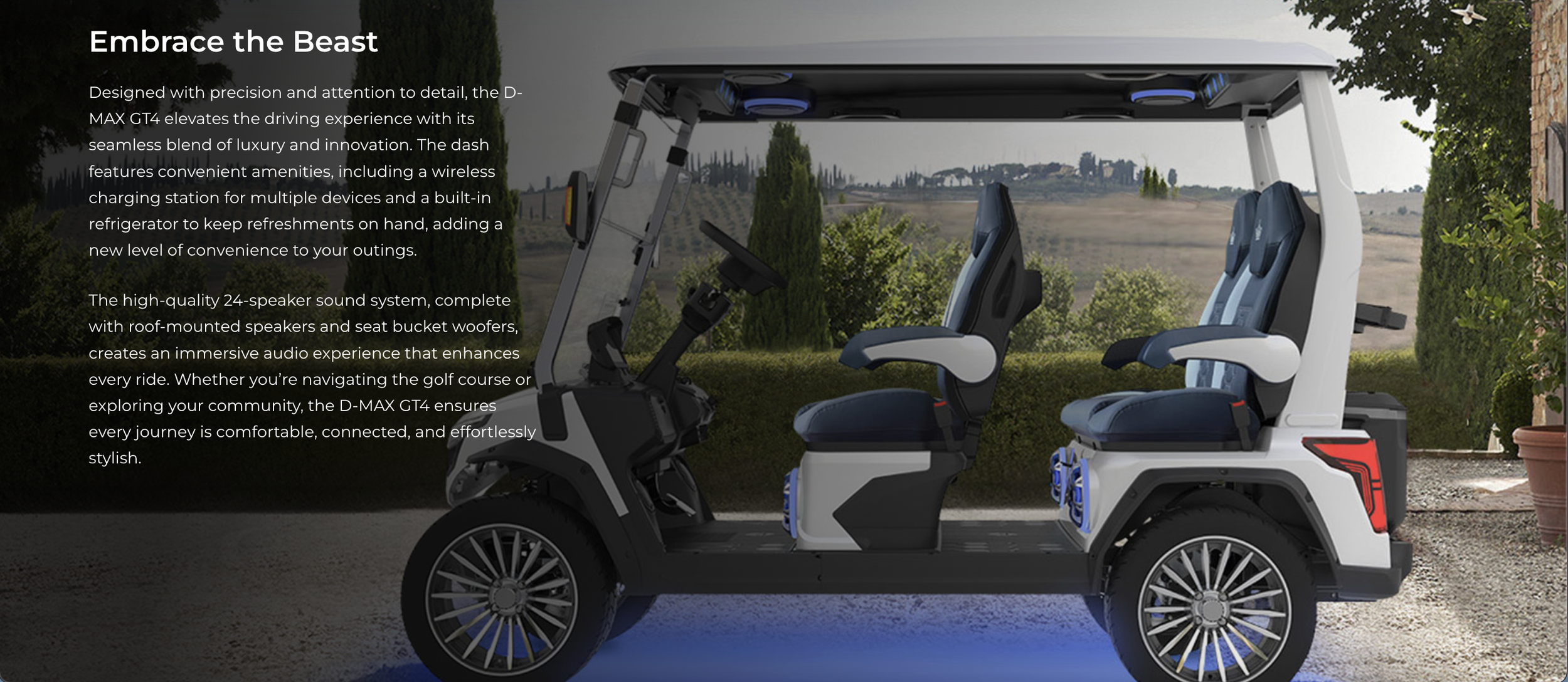Evolution D-MAX GT4 is crafted for those who demand both functionality and elegance in a cart. Its advanced features, including a spacious four-seat configuration and high-quality, automotive-grade luxury seats with rotating armrests, provide unparalleled comfort for every passenger.