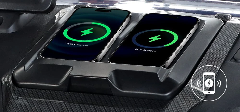 Power Up on the Go – Keep your devices powered up effortlessly with the dual wireless charging pad on the dash, designed to charge two cell phones simultaneously, ensuring you stay connected without the clutter of cables.