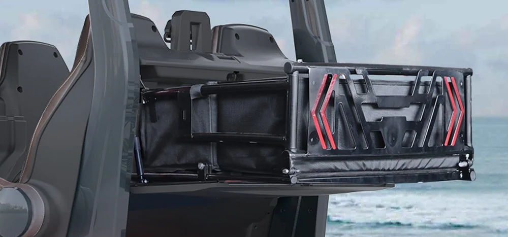 Transform the rear of your golf car with the fully extended retractable tray, equipped with an optional golf bag holder extension to securely carry up to four golf bags. Perfect for group outings, it provides maximum storage and functionality for all your golfing essentials.